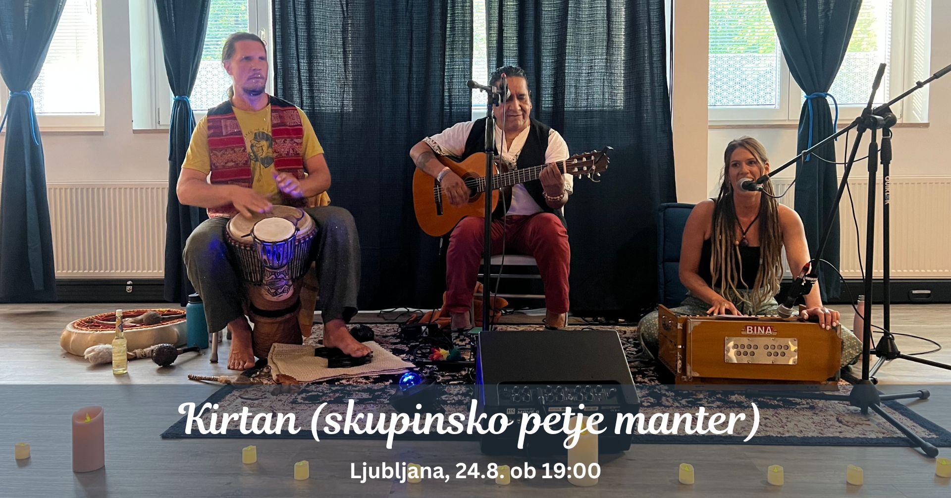 Kirtan je skupinsko prepevanje manter, kjer vsak s svojo edinstveno vibracijo glasu prispeva k ustvarjanju prostora za odpiranje srca in povezovanje preko zvoka.