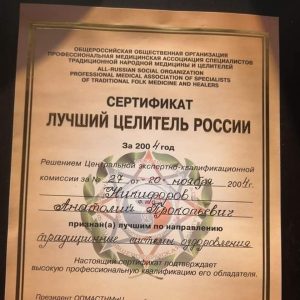 Certifikat, izdan s strani “Vsesplošnega združenja tradicionalnih zdravilcev Rusije”, potrjuje, da je Anatolij prejel uradni naziv “Najboljši zdravilec Rusije” za področje tradicionalnih sistemov zdravljenja. Certifikat je rezultat presoje centralne ekspertno-kvalifikacijske komisije, kar pomeni, da so njegove sposobnosti testirali in priznali tudi zdravstveni strokovnjaki in komisije znotraj državnih struktur.