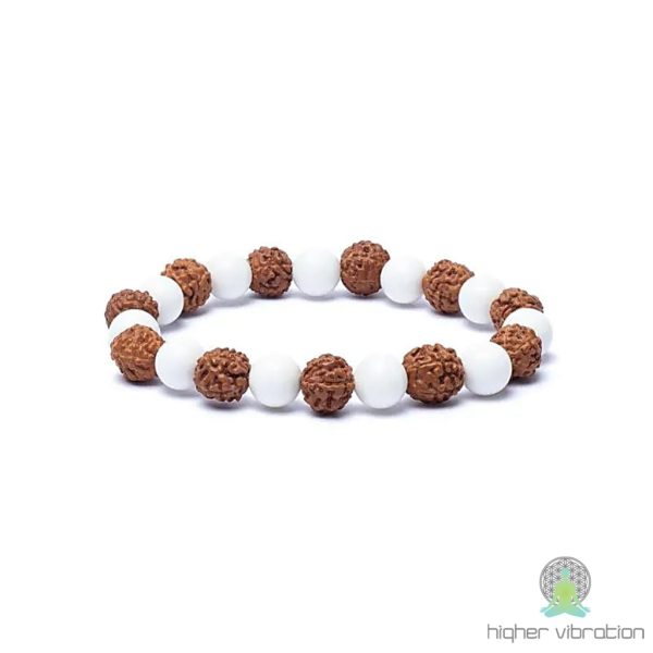 Elastična zapestnica iz rudrakše in prahu školjke združuje duhovno moč manter z energijo prebujenja in blagoslova.