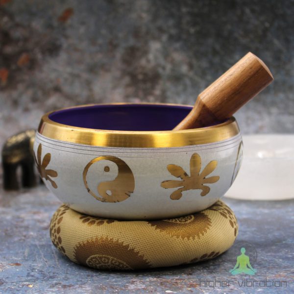 Set pojoče sklede jin in jang – bela/vijolična vsebuje obojestransko palico, blazino in pojočo skledo. Pakiran je v okrasni škatli. Yin Yang je simbol ravnovesja in harmonije, ki predstavljha medsebojno delovanje nasprotujočih si sil v vesolju.