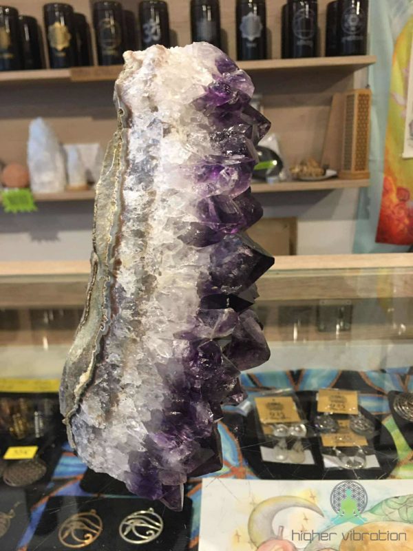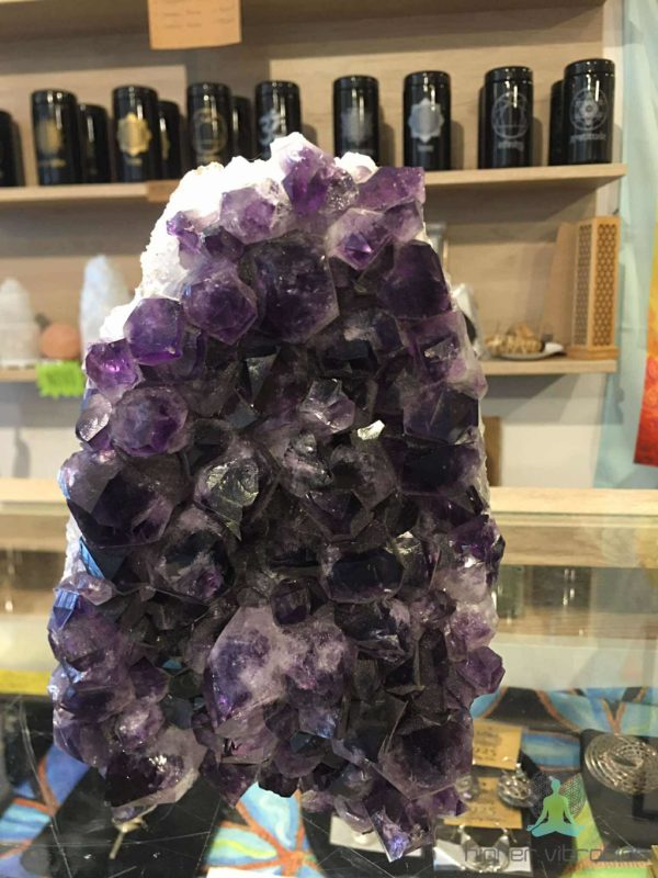 Ametist že stoletja velja za kamen zaščite in očiščenja – raztaplja negativne energije ter ustvarja ščit okoli energije posameznika ali prostora. Ta velik kristal deluje kot most med zemeljskimi in nebeškimi energijami, pomaga uravnotežiti tretjo oko in kronsko čakro ter omogoča globlje meditacije in duhovne vpoglede. Njegova prisotnost v prostoru ali osebni bližini prinaša občutek umirjenosti, blaženosti in jasnosti, zmanjšuje stres ter spodbuja duhovni razvoj.