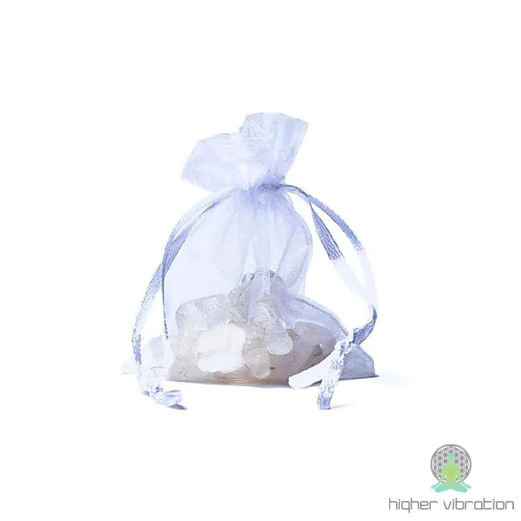 Bela organza vrečka z zapiralno vrvico, idealna za elegantno pakiranje manjših daril, nakita ali simboličnih predmetov.