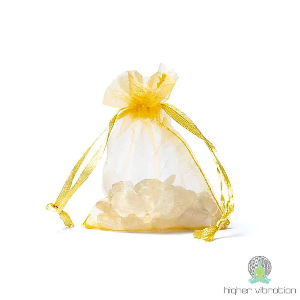 Zlata organza vrečka z zapiralno vrvico, idealna za elegantno pakiranje manjših daril, nakita ali simboličnih predmetov.