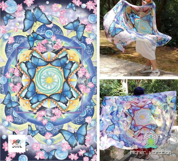 Ruta iz svile z motivom METULJEV v dimenzijah 100 x 100cm ALI 100 x 180cm. Del kolekcije Art Feed Soul.