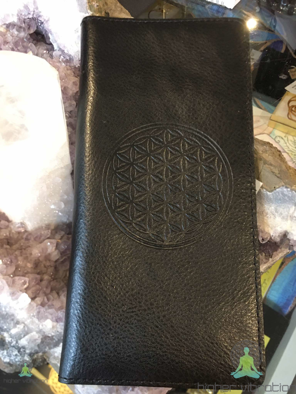 Usnjena denarnica z motivom rože življenja v črni barvi. Za shranjevanje denarja in kartic.
