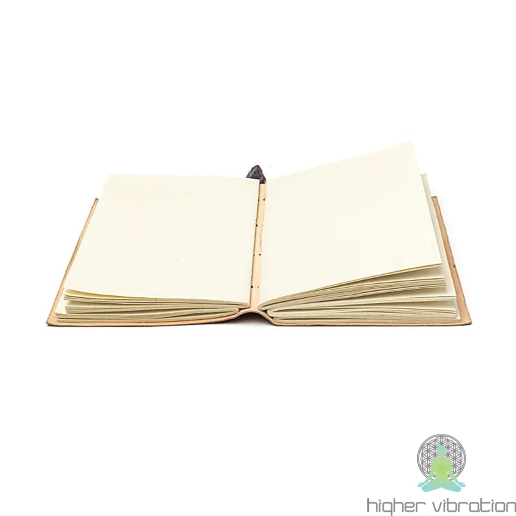 Zvezek ali skicirka iz recikliranega papirja, s 100 praznimi stranmi, platnicami iz umetnega usnja in dragim kamnom na zapiralnem traku.